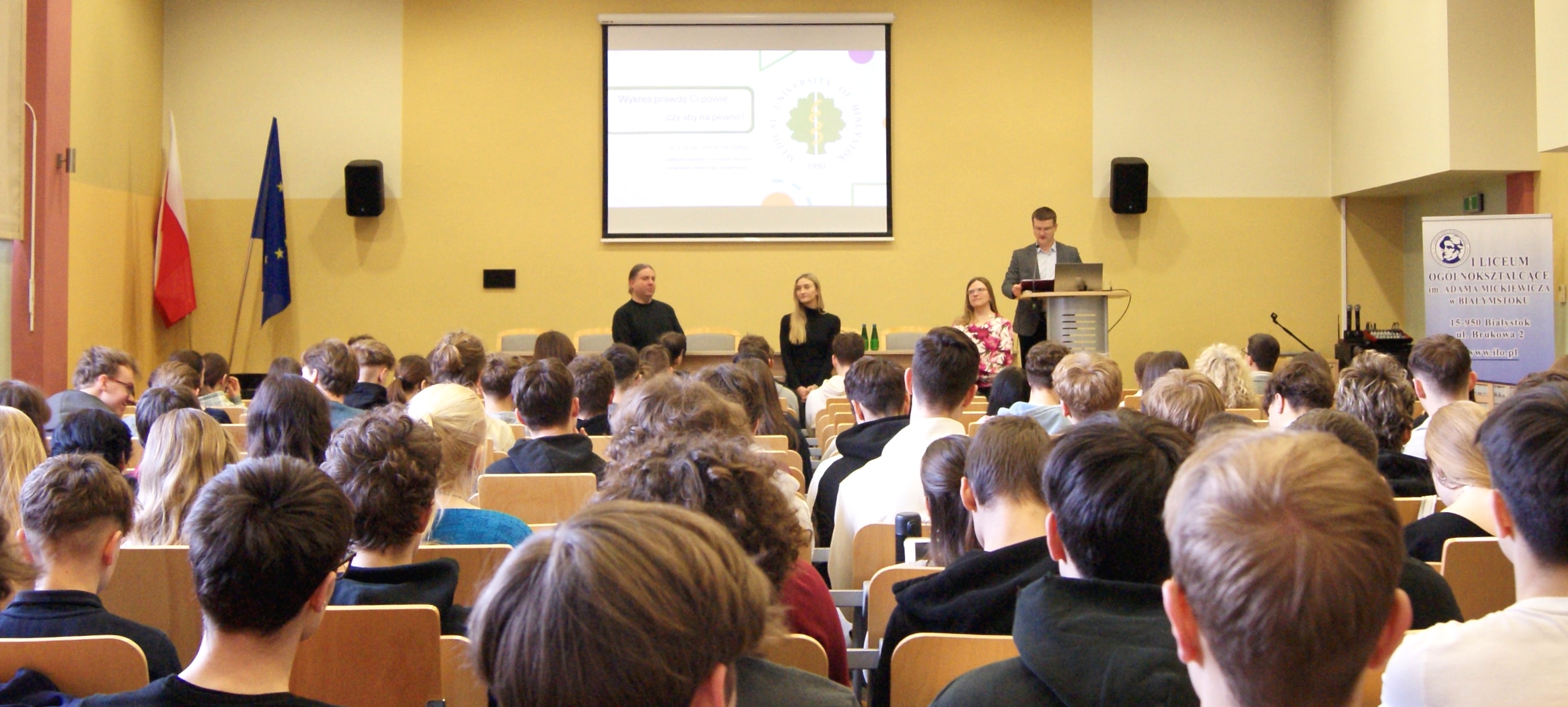Kolejny Dzień Nauki w naszym liceum rozpoczęliśmy od spotkania uczniów z Panią dr Adrianną Zańko, asystentem w Zakładzie Biostatystyki i Informatyki Medycznej Uniwersytetu Medycznego w Białymstoku, która wygłosiła wykład na temat: „Wykres prawdę ci powie… czy aby na pewno?”. Prelegentce towarzyszyły osoby wspomagające: Pani dr Dorota Jankowska i Pan dr Michał Pawłowski.