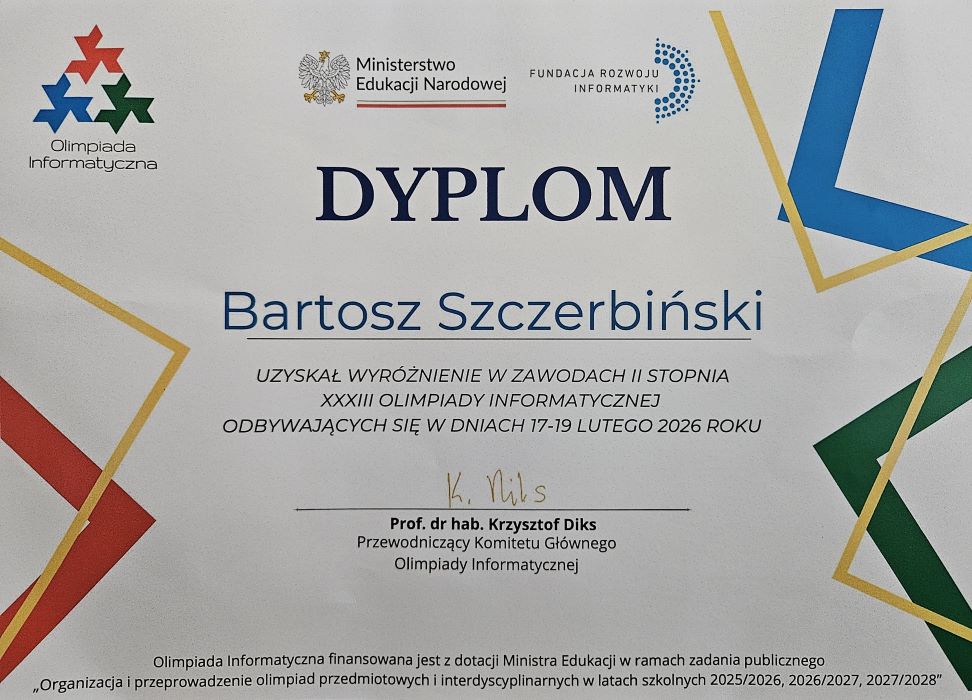 Miło nam poinformować, że nasz uczeń Bartosz Szczerbiński (kl. 4 delta) został wyróżniony przez Komitet Główny XXXIII Olimpiady Informatycznej. Bartek znalazł się w gronie 45 uczestników i uczestniczek zawodów II stopnia Olimpiady Informatycznej, którzy otrzymali dyplomy i wyróżnienia za uzyskanie wysokich wyników.