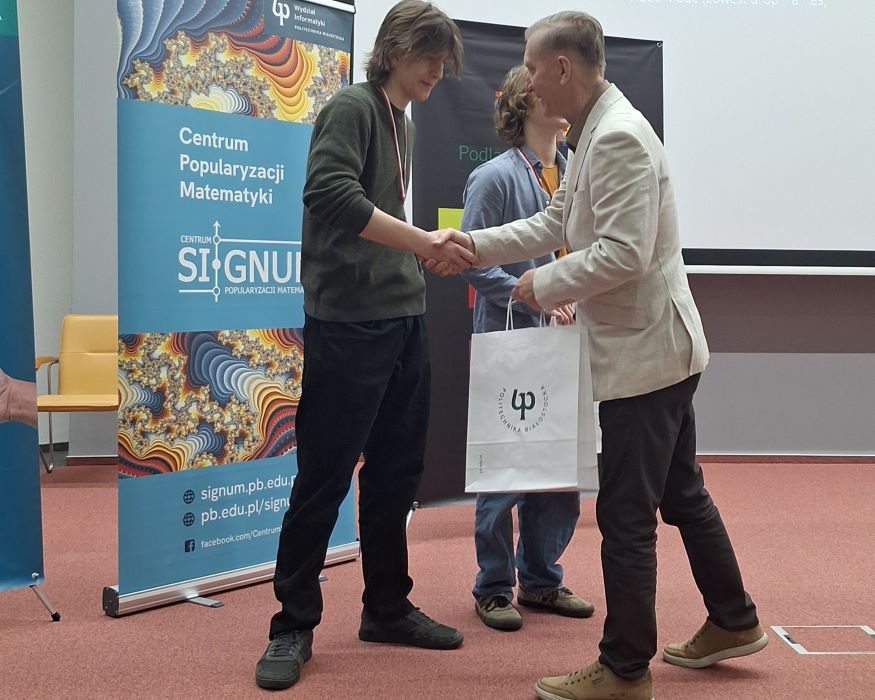 Miło nam poinformować, że nasi uczniowie: Dariusz Sulima i Jan Ksepko (obaj z kl. 3 gamma) otrzymali wyróżnienie w XI edycji Ogólnopolskiego Konkursu "Matematyka Stosowana" organizowanego przez Centrum Popularyzacji Matematyki Signum przy Wydziale Informatyki Politechniki Białostockiej.