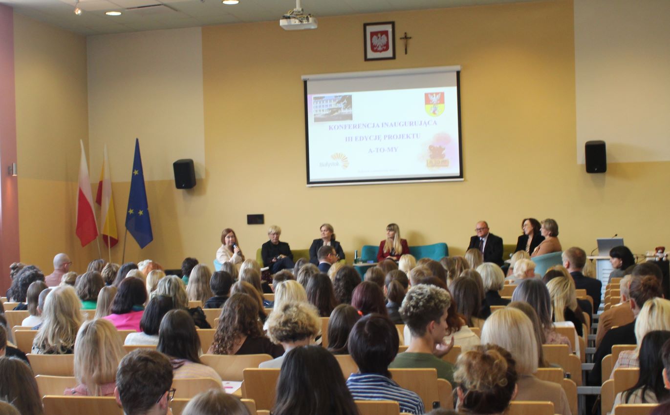 W piątek, 3 października 2025 r., I Liceum Ogólnokształcące im. Adama Mickiewicza w Białymstoku miało zaszczyt gościć Panią Monikę Hornę-Cieślak. Rzecznik Praw Dziecka wzięła udział w spotkaniu inaugurującym III edycję białostockiego programu edukacyjnego A-TO-MY, które odbyło się w szkolnej auli. Pani Rzecznik spotkała się z młodzieżą I LO na lekcjach, zwiedziła szkołę, poznając jej historię, atmosferę oraz codzienność.