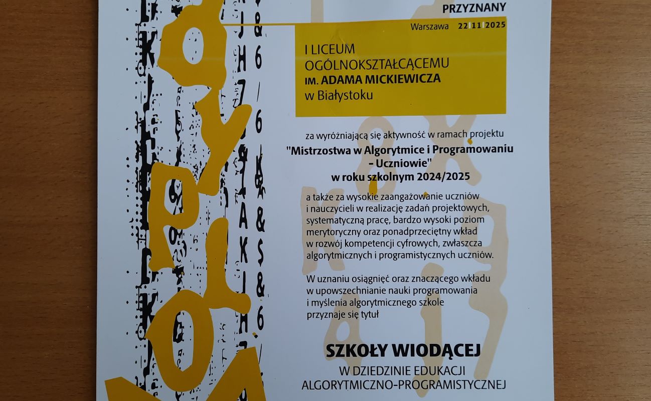 Jest nam miło poinformować, że nasze liceum jako jedno z dziewięciu otrzymało dyplom uznana i tytuł "Szkoły wiodącej w dziedzinie edukacji algorytmiczno-programistycznej" za wyróżniającą się aktywność w ramach projektu Mistrzostwa w algorytmice i programowaniu - Uczniowie w roku szkolnym 2024/2025.
